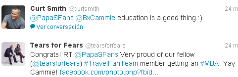 In other news: Quick shout out to our travel fan team member, Cammie, on getting her MA recently! Even the band put their stamp of approval on that! All praise be to the Higher Power that our travel fan pals in the mid-west part of the states were spared during some tragic tornadoes. Carri, Lisa and Becky are all safe. Please note during bad weather we do ask that all members check-in so we can know you are okay or at least send for help in the event that it is needed. Follow us on Twitter (@papasfans) to interact and stay in touch. And always follow the band (@curtsmith) & (@tearsforfears).