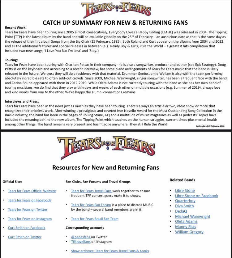 As mentioned, the band’s management’s marketing teams brought in a ton of returning fans. Some mentioned their fandom kind of dropped off after Seeds of Love. And the headlines around the band’s album have all been about a “comeback” as if the band has been hiding away in some cave for the last 20 years…and we know that’s not true. The band has been touring almost annually since ELAHE was released. So at the top of the Tears for Fears’ Travel Fans accounts you’ll find a summary and guide that helps new people and returners.
