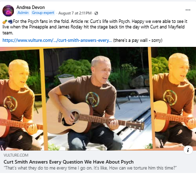 Psych fans gather ’round. We trust you have not missed this interview but in case you did, Curt had an intriguing chat with Devon Ivie for the publication Vulture. It was a walk down memory lane that touched on the many episodes Curt was featured in during the Psych TV series from 2010 forward. It details how it all came to be. It also inadvertantly explains a lot about the pineapple on stage and James Roday mysteriously in the mix in the back of the room at McCabe’s that one evening. Remember that? Such an incredible night back in November of 2010. It’s all here in the archives and Curt goes all in with details of each interaction with the cast and crew in this specific interview. It’s awesome! The interview has a lot of Curt’s thoughts about the experience and how great it is to work with their team. Well worth working your way past the paywall for the read. He also drops some information goose eggs including forthcoming jam sessions with Roland after Las Vegas. Curt also noted the arrival of Roland’s first daughter, baby Eula. We wish he and good Lady Emily a lifetime of joy with the newest member of their family. Go ahead and read it for yourself. This one is a keepsake.